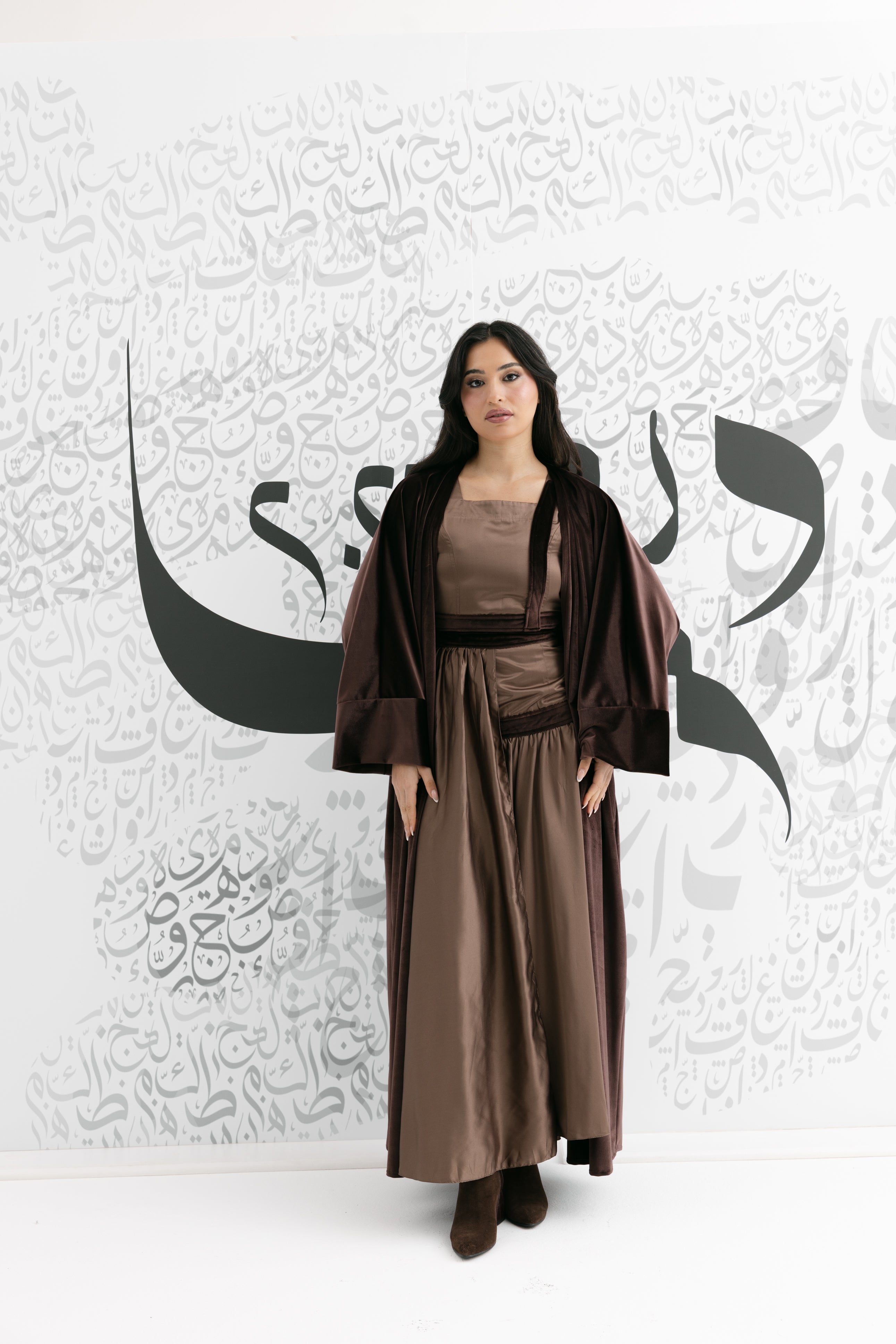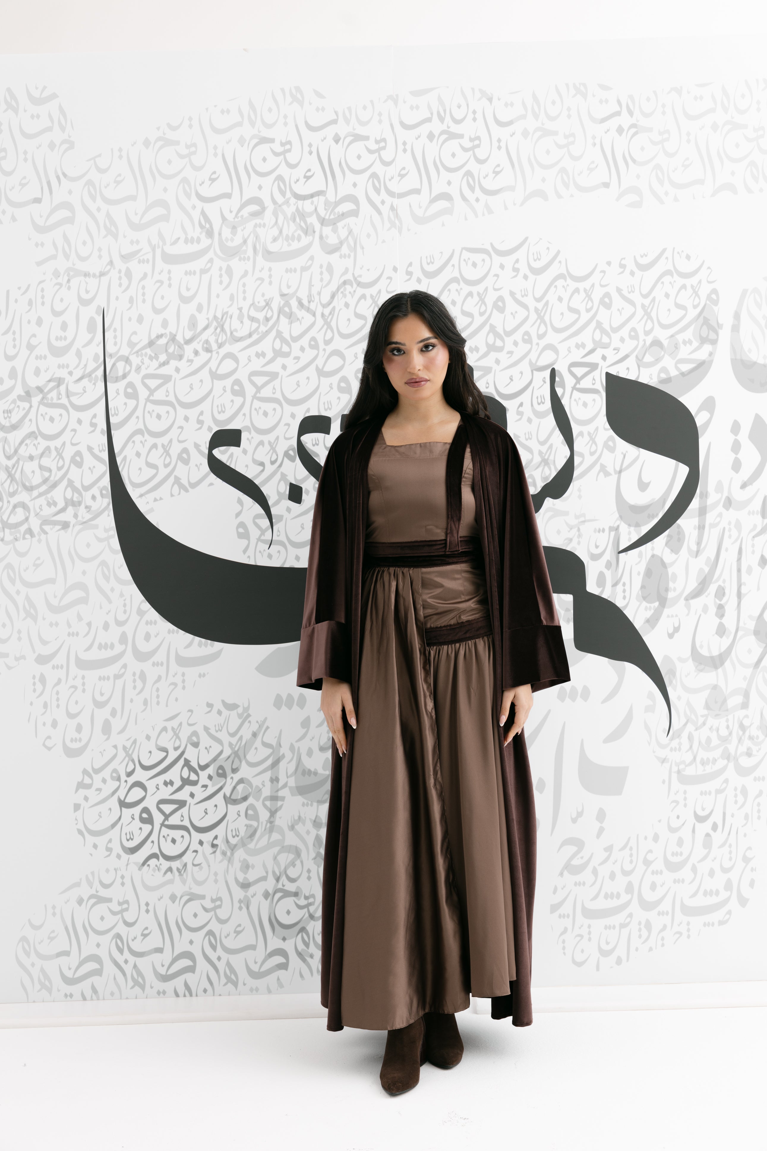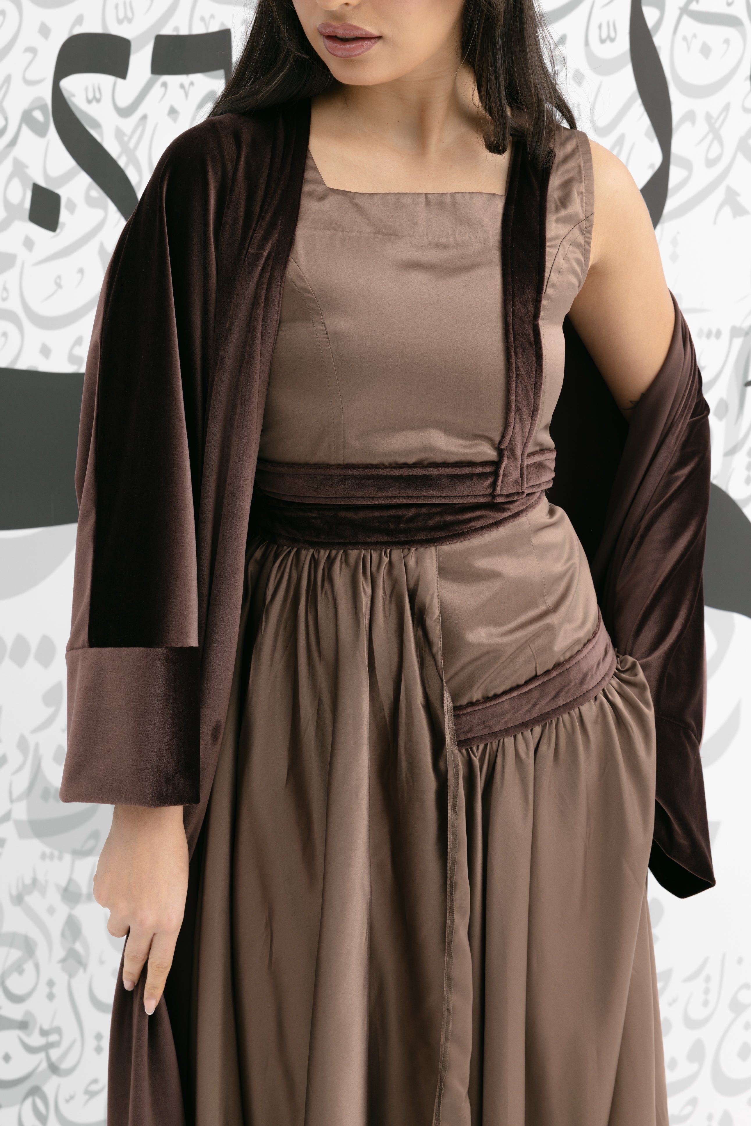 A coordinated brown set featuring a sleeveless square-neck top, a flowing skirt, and a long open-front bisht with wide cuffs for an elegant ramadan look!