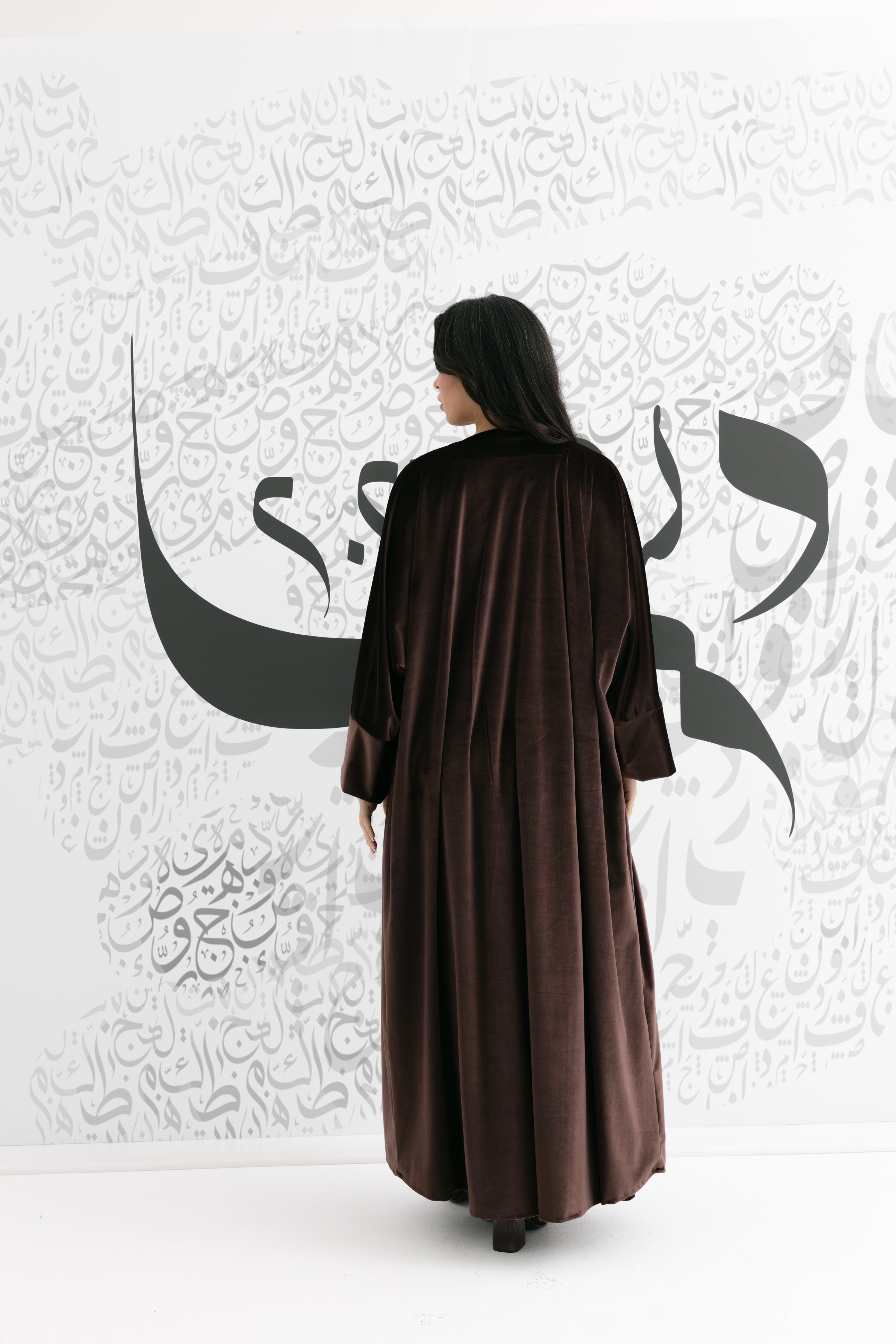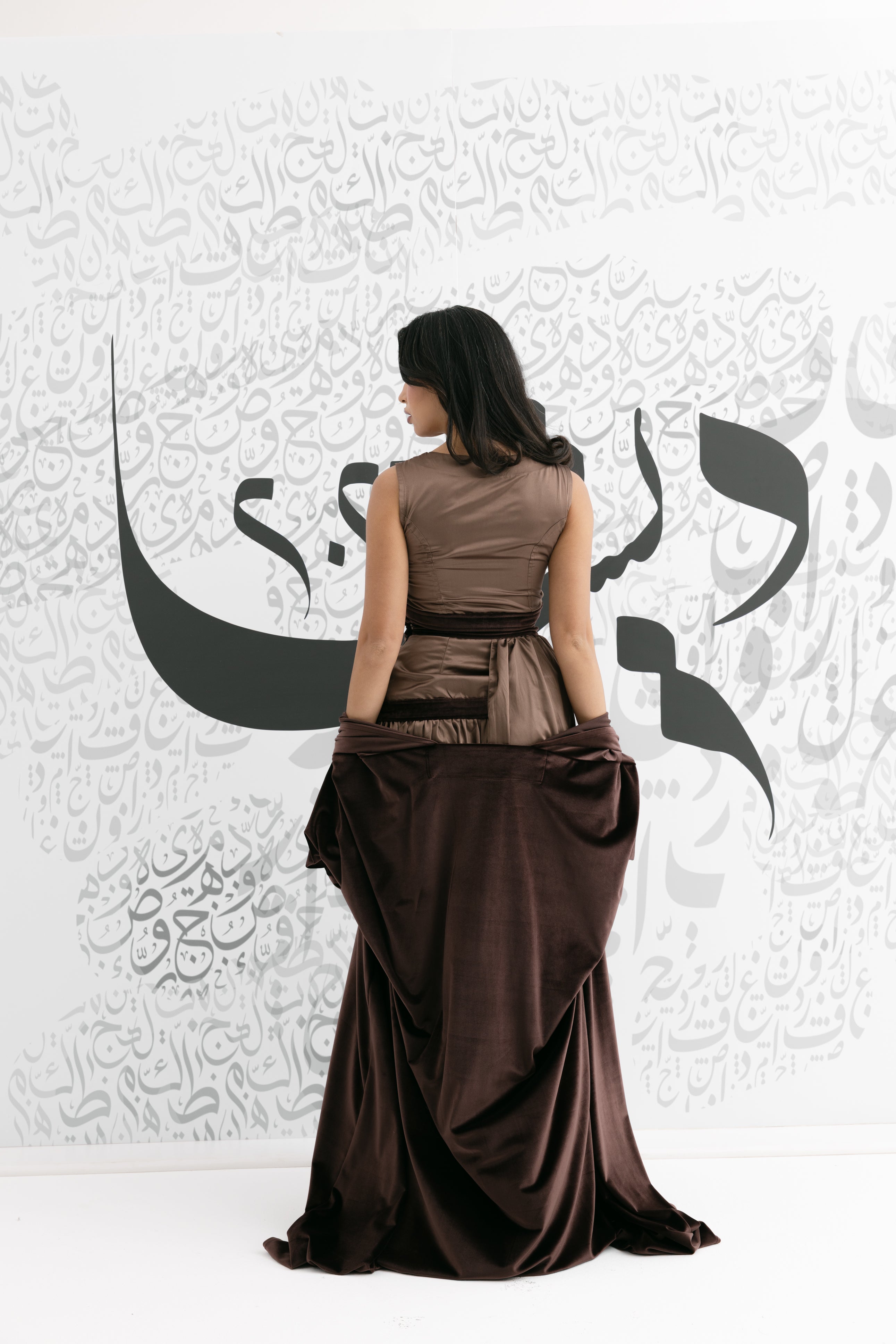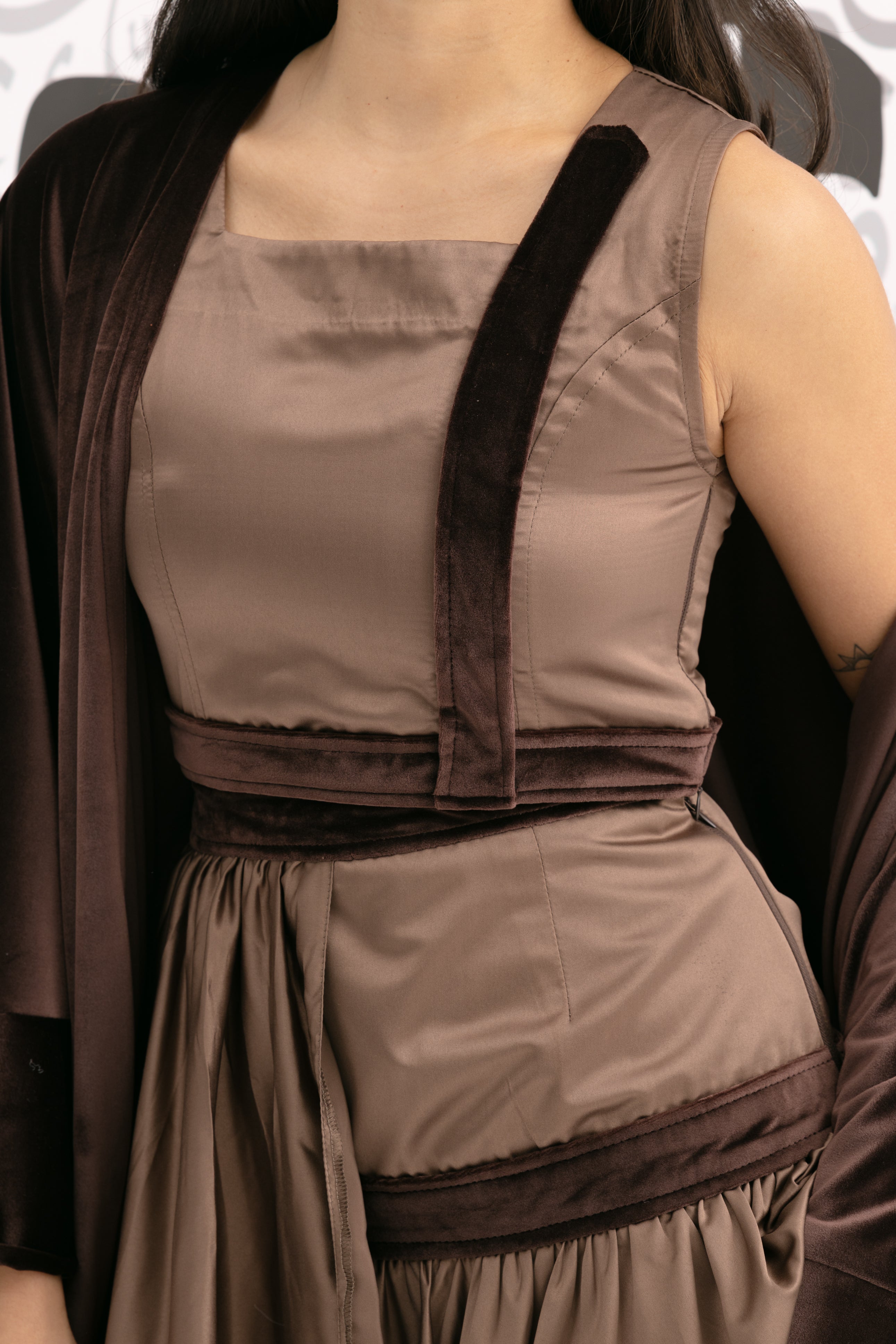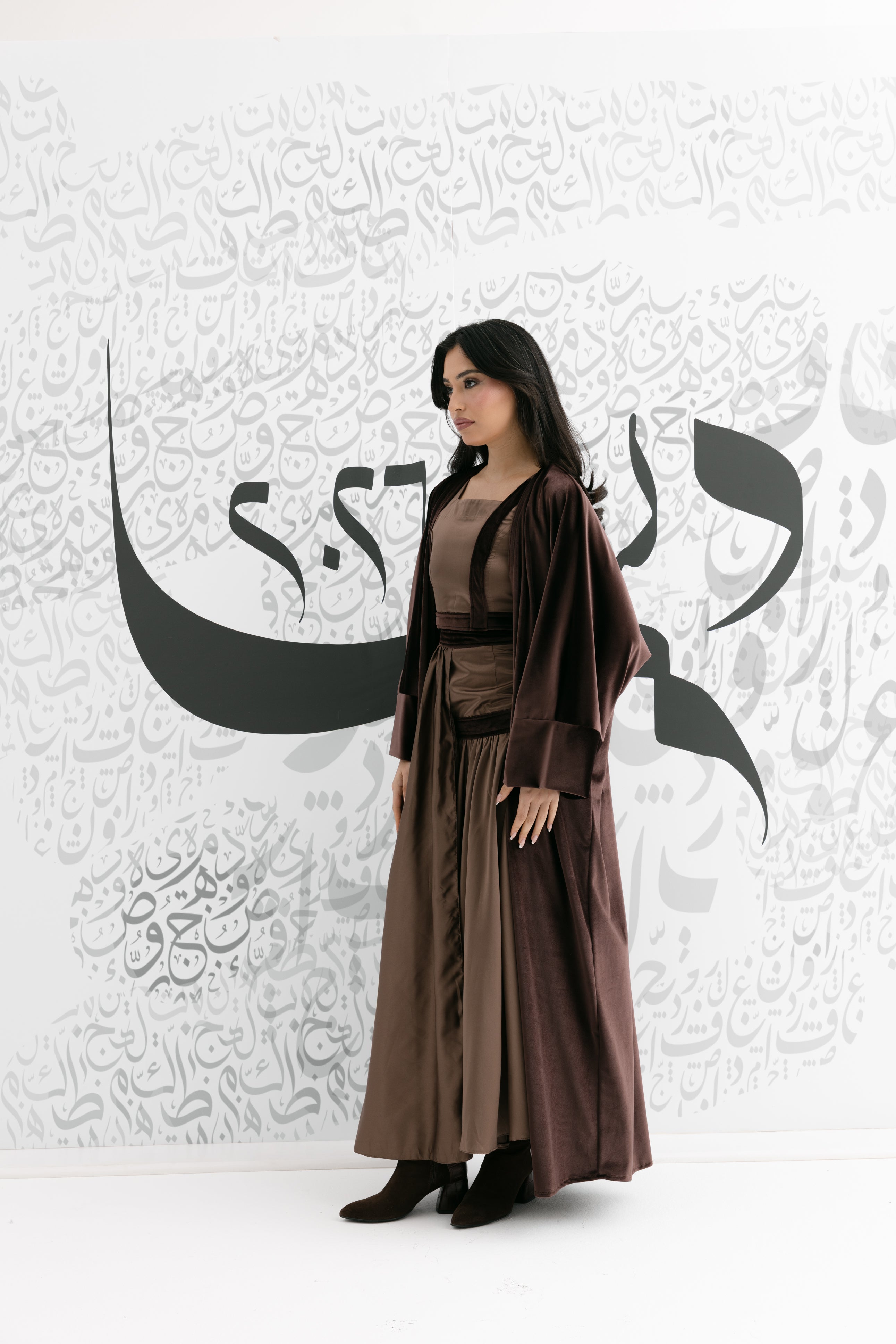 A coordinated brown set featuring a sleeveless square-neck top, a flowing skirt, and a long open-front bisht with wide cuffs for an elegant ramadan look!