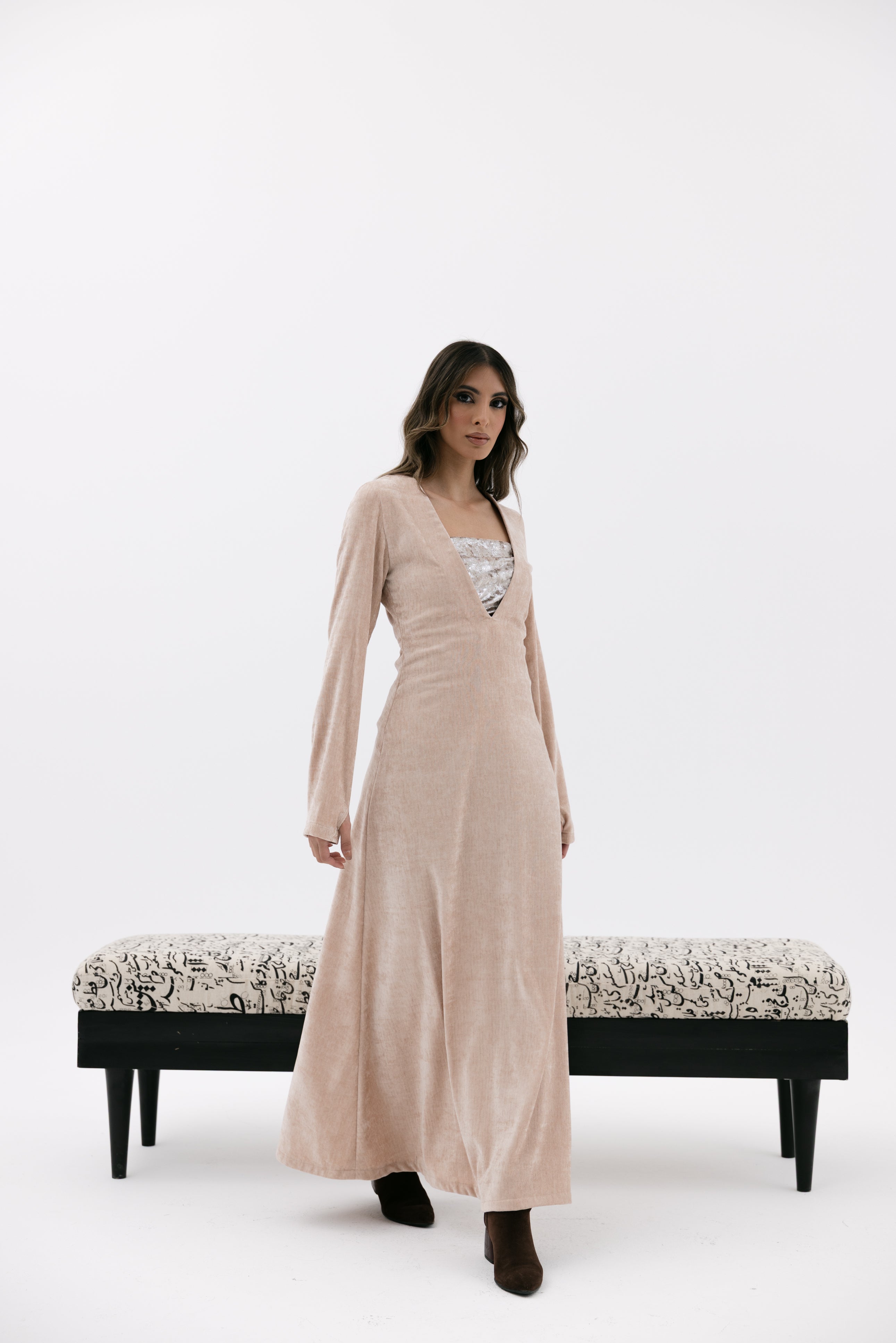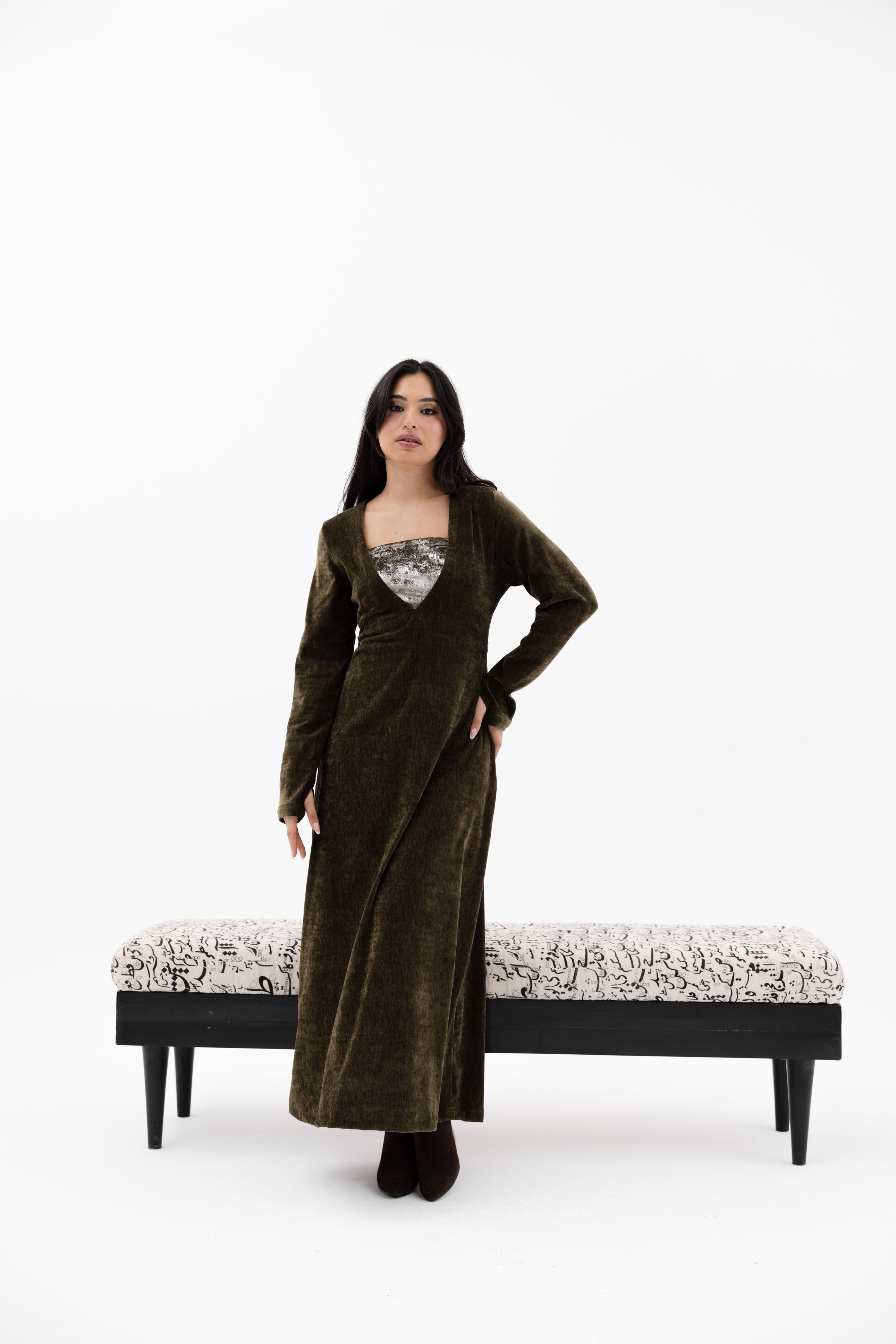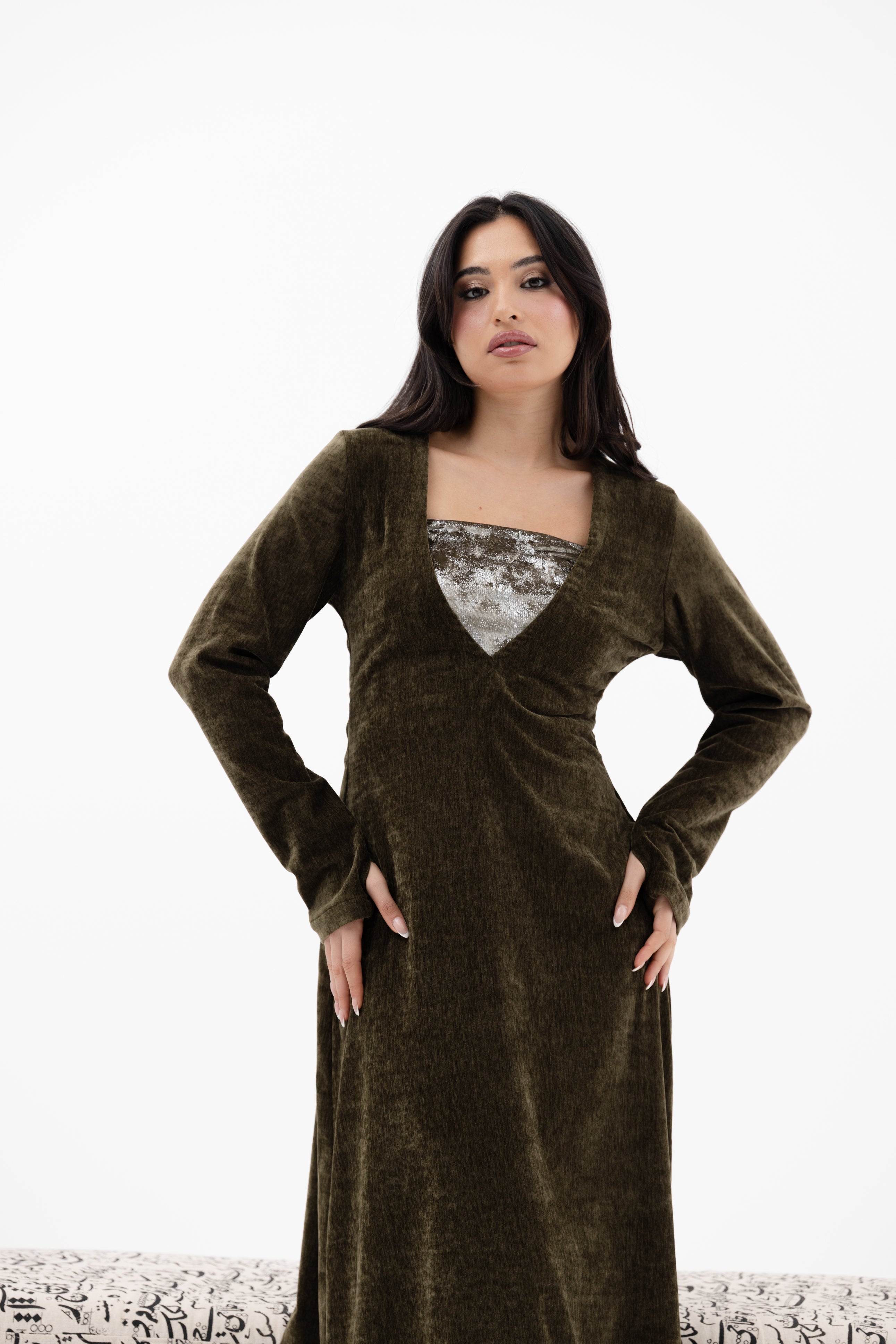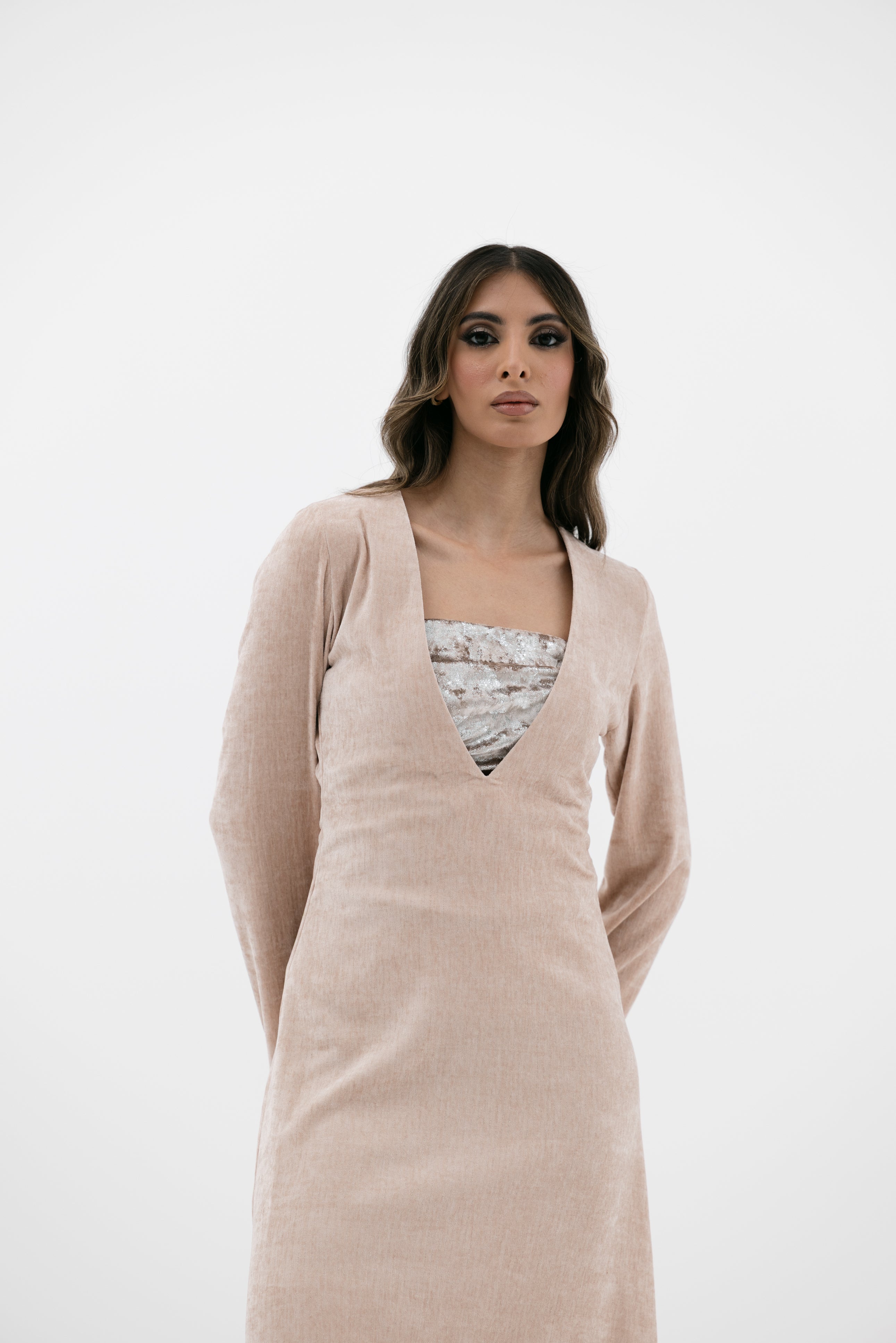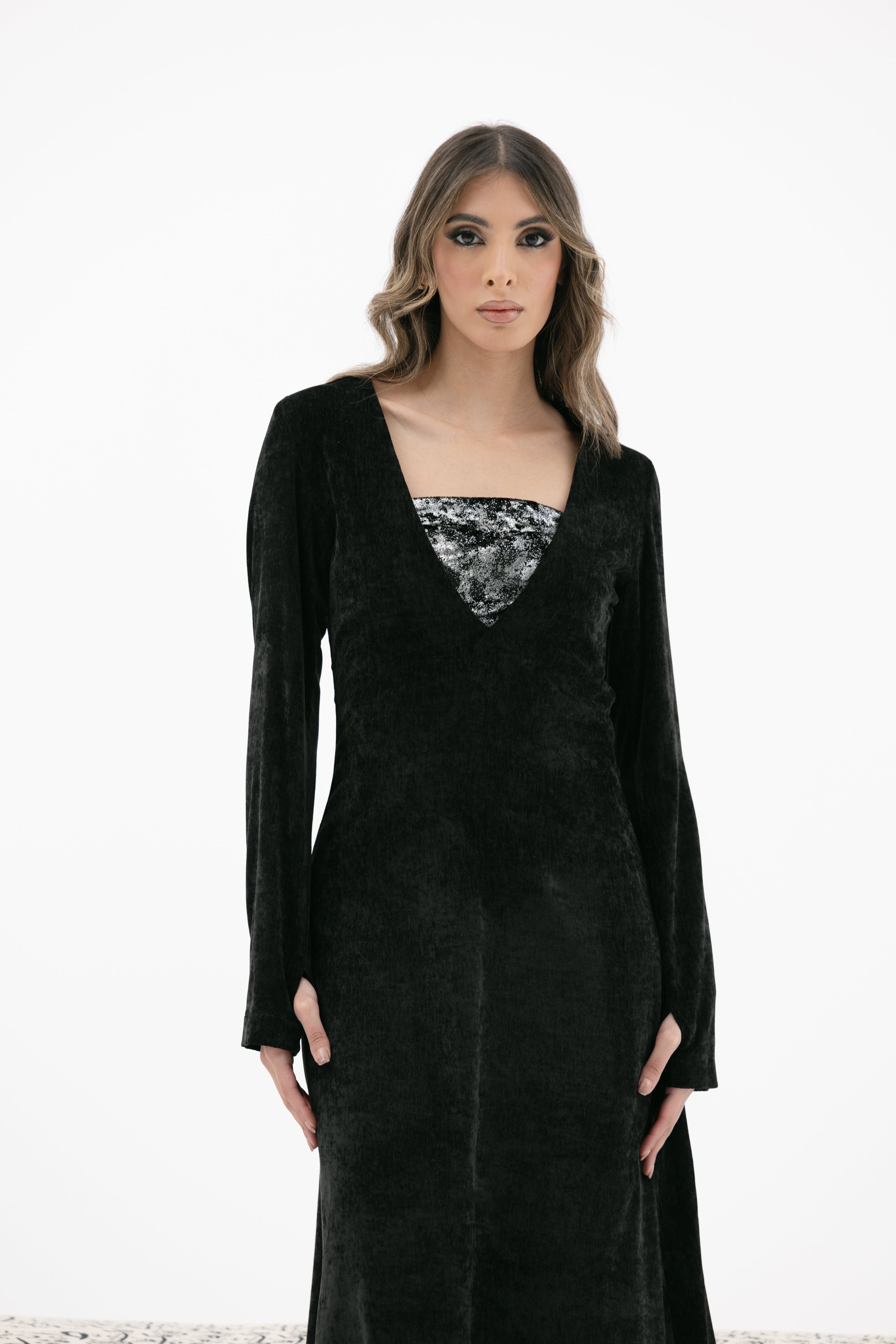 A V-neckline velvet dress with long sleeves glove-style sleeves an an inner strapless cropped top.