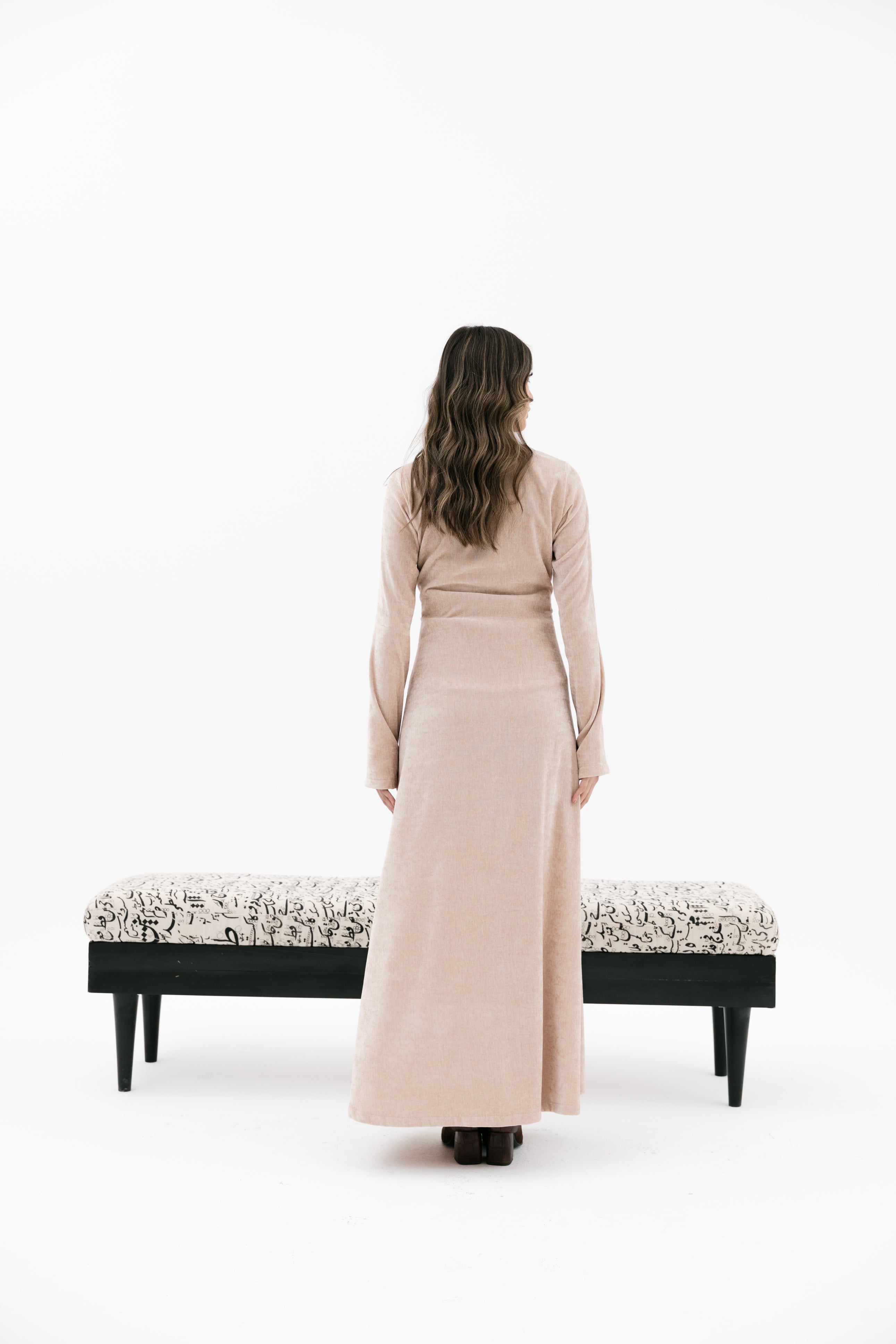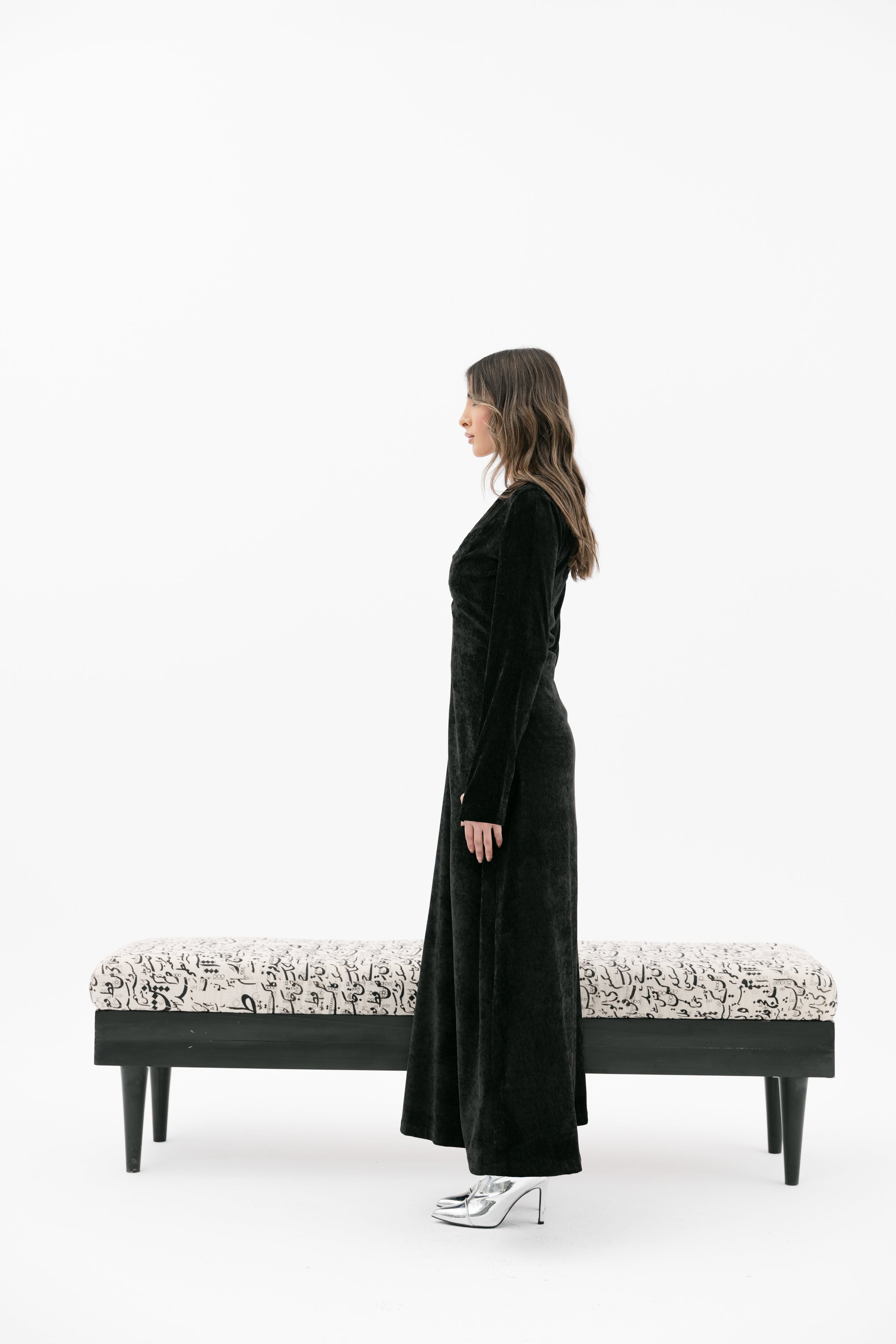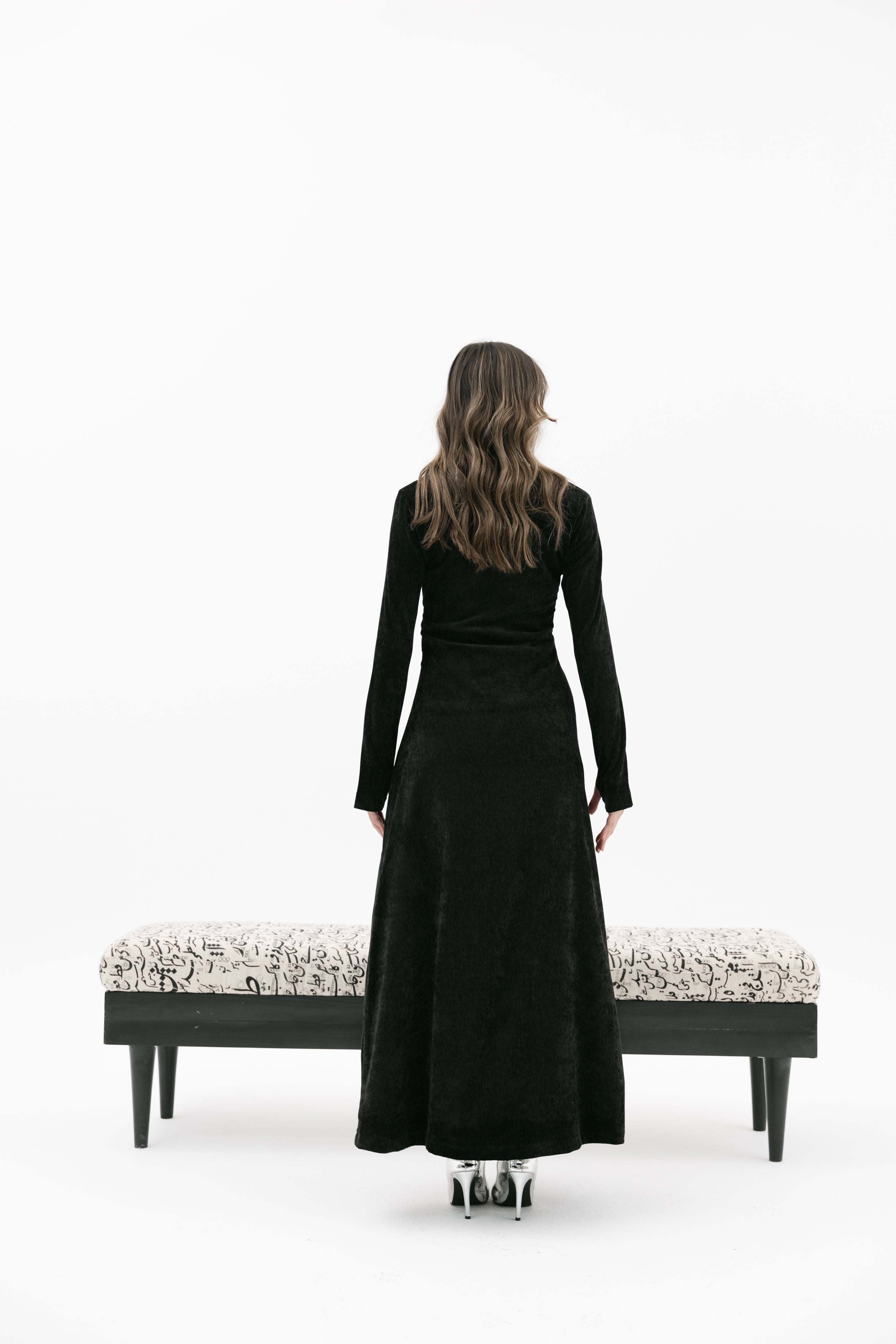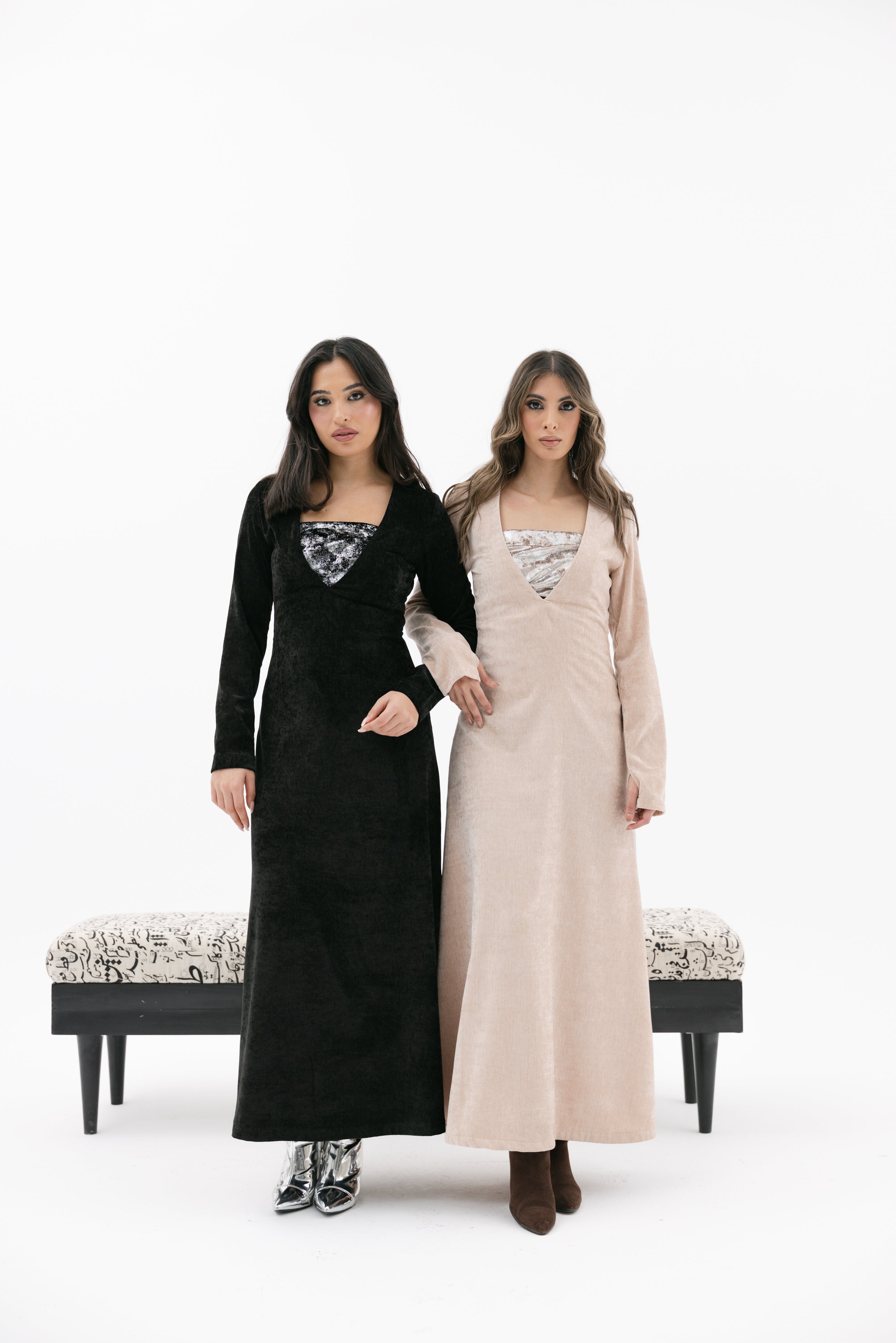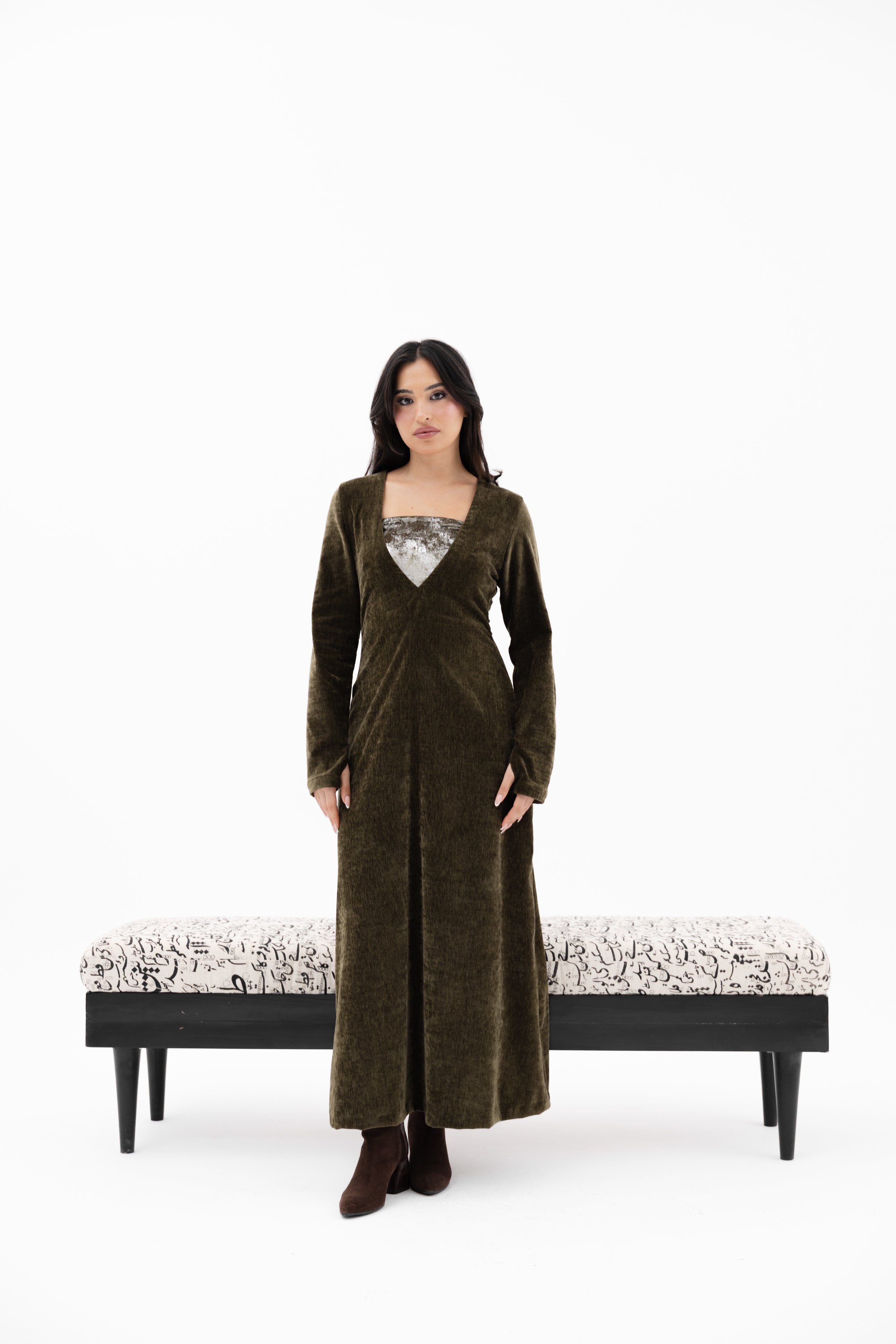 A V-neckline velvet dress with long sleeves glove-style sleeves an an inner strapless cropped top.