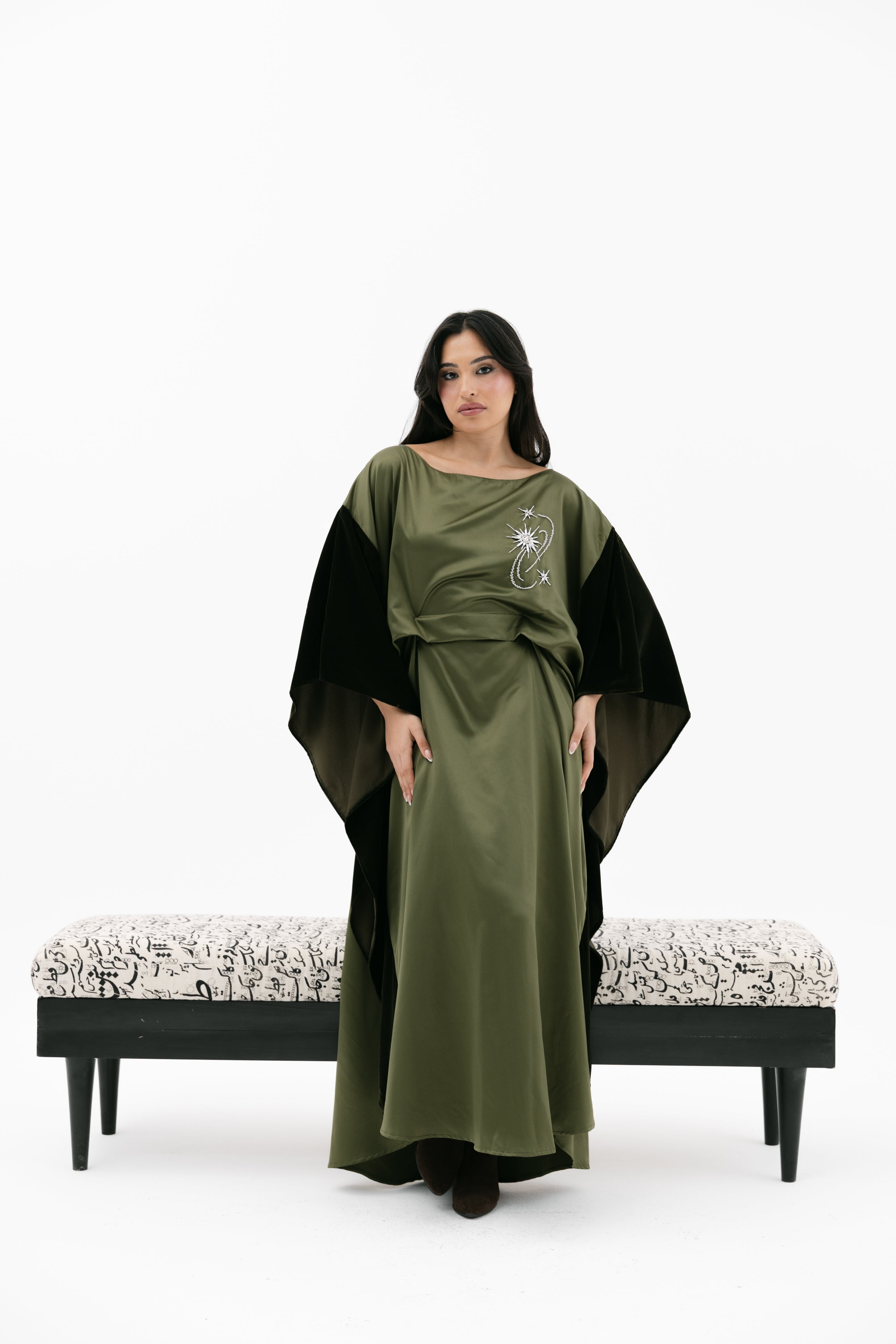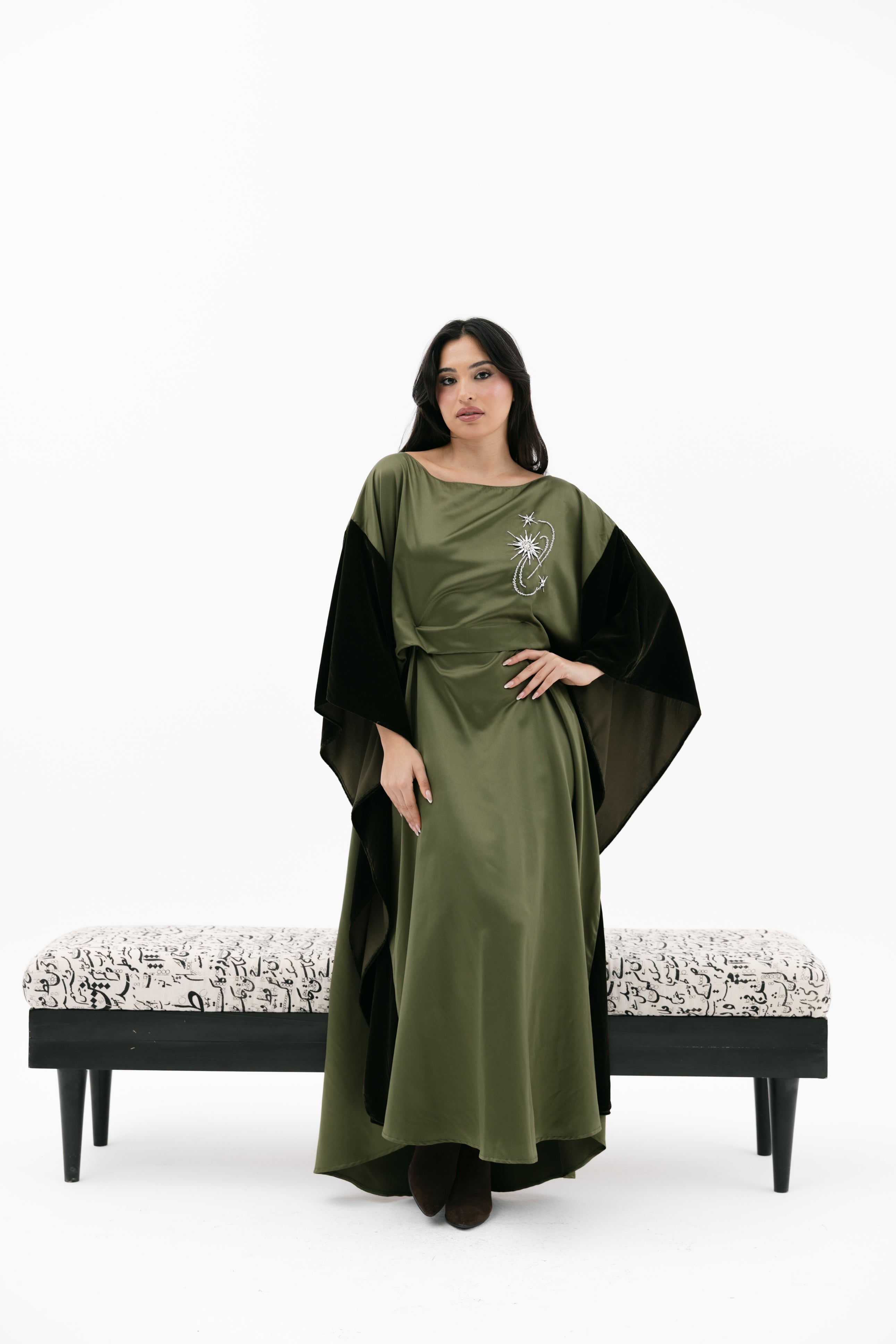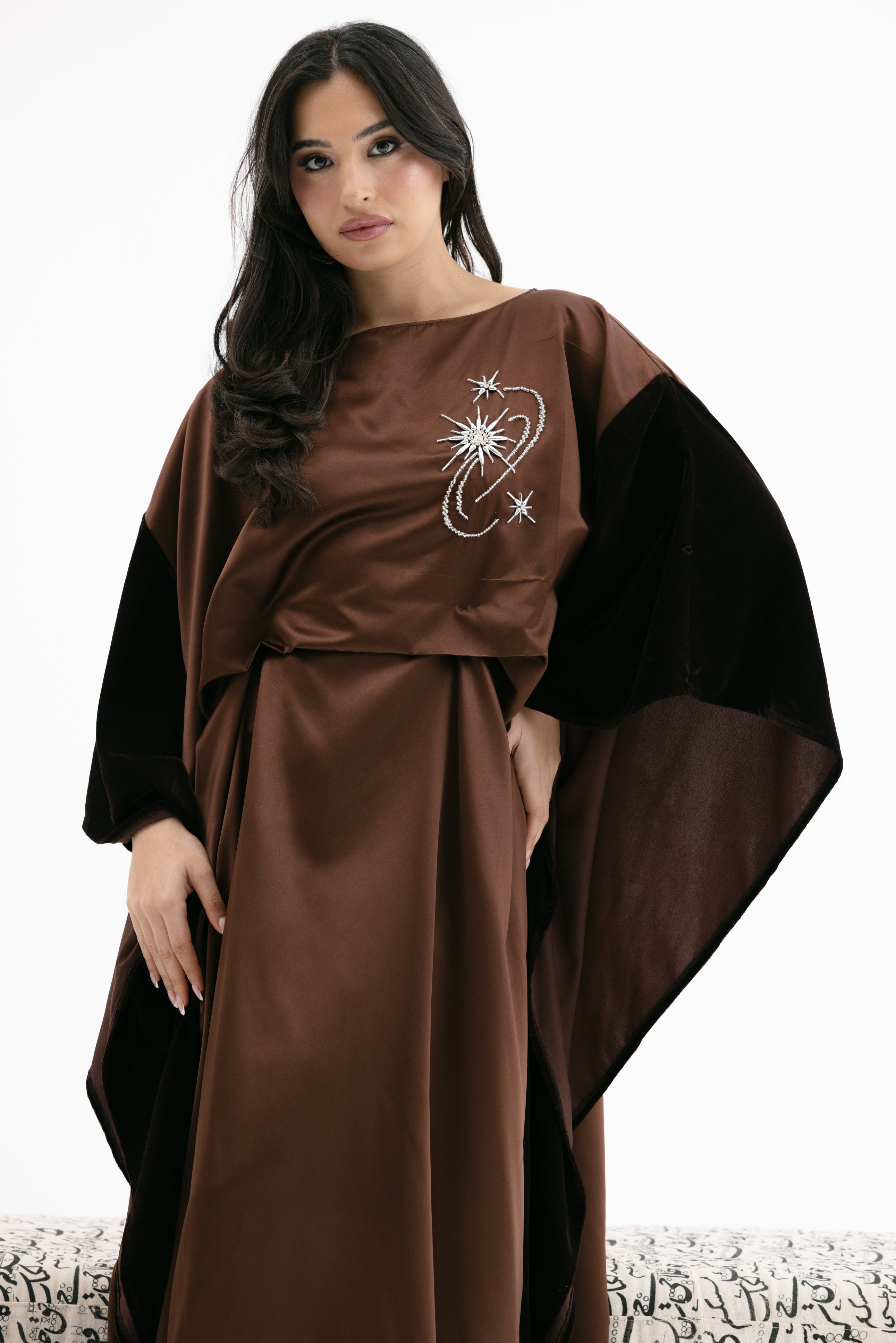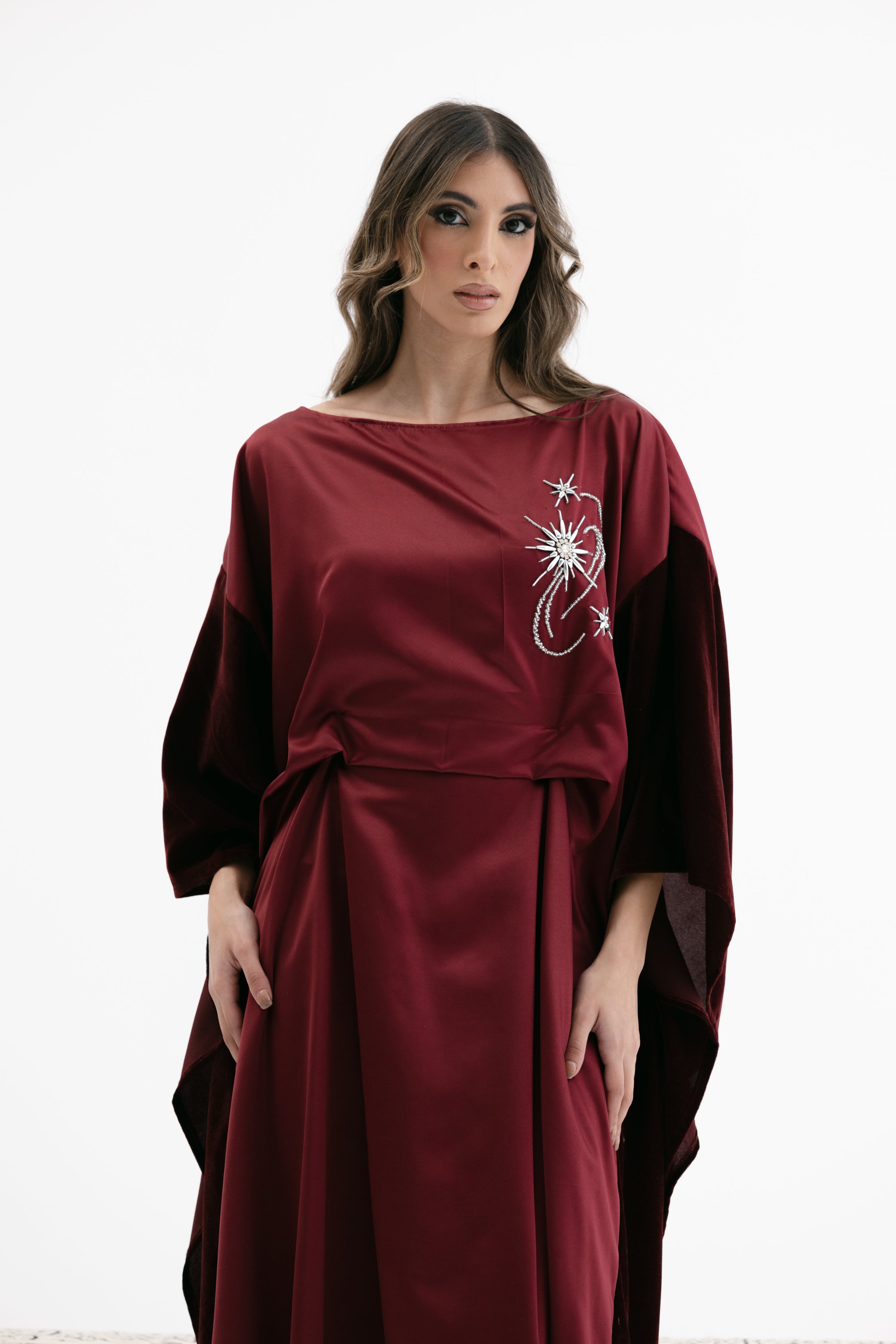 An elegant dress with a relaxed fit featuring a wide cape - style velvet sleeves, a subtle embroidered chest detail, and an inner tie / knot for an adjustable fit.