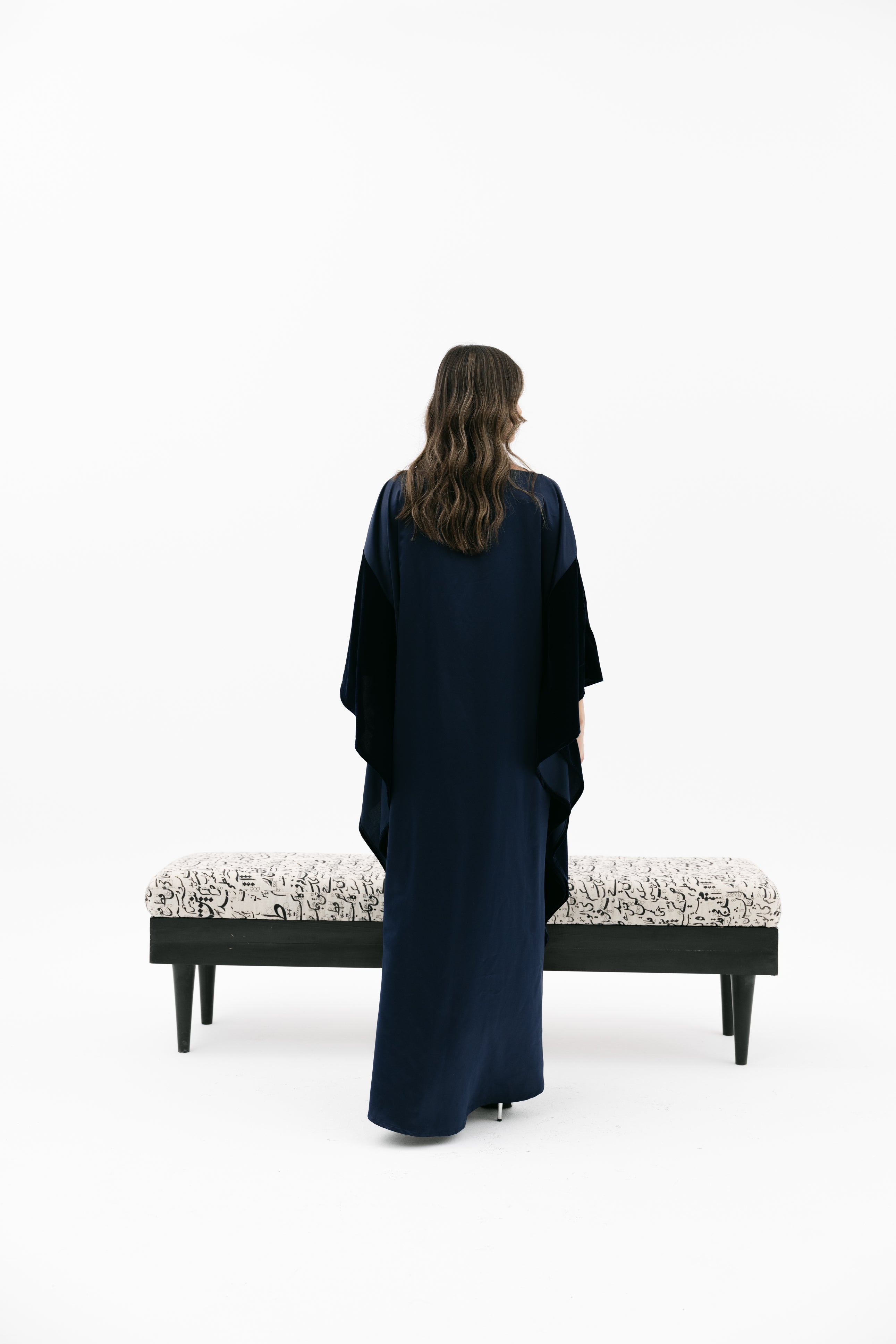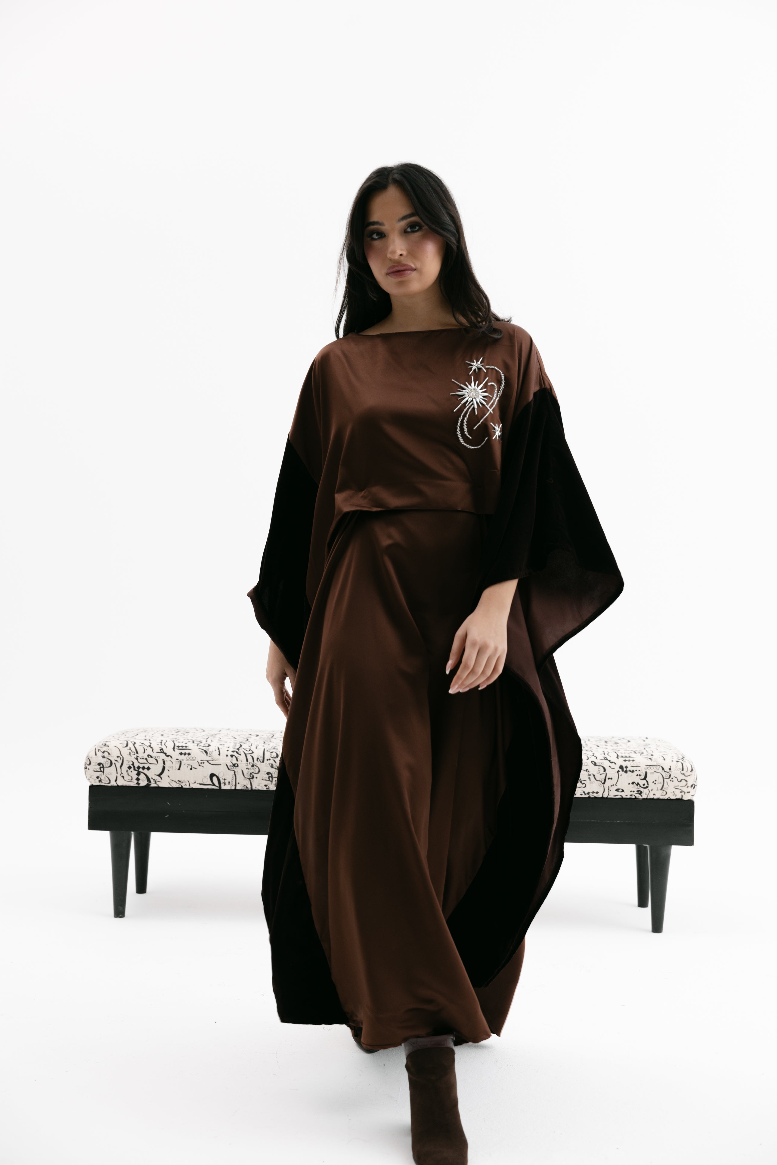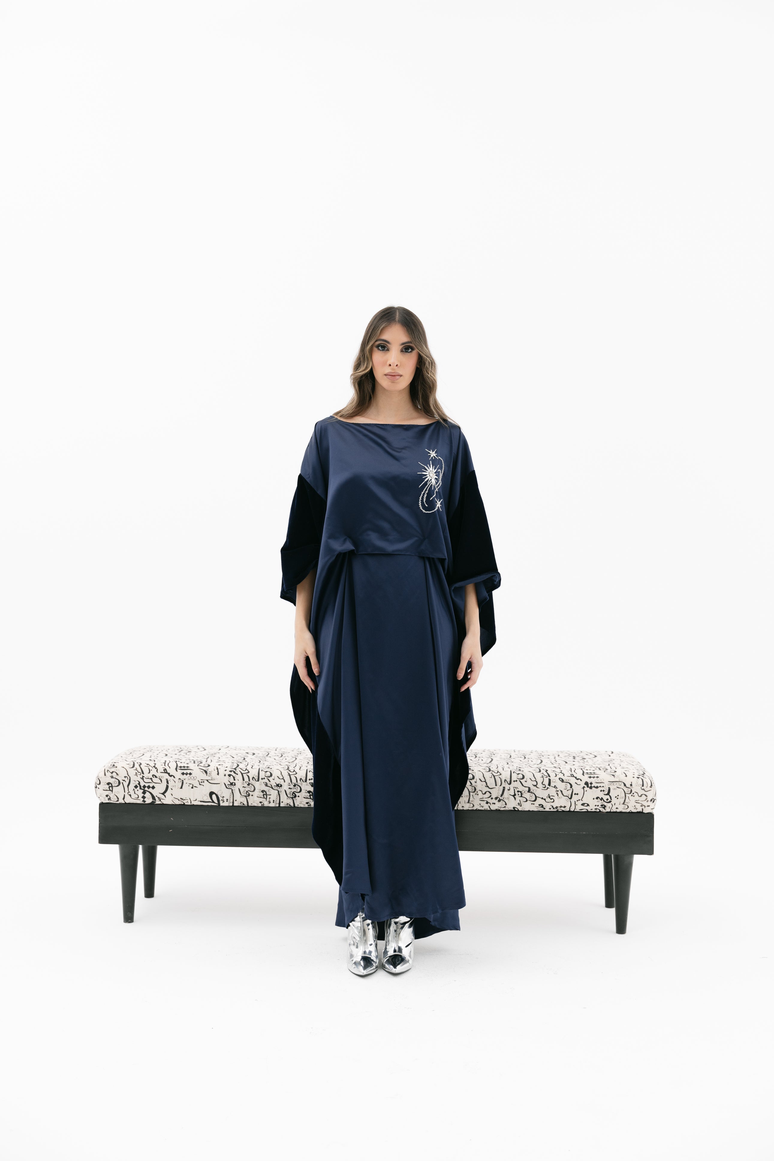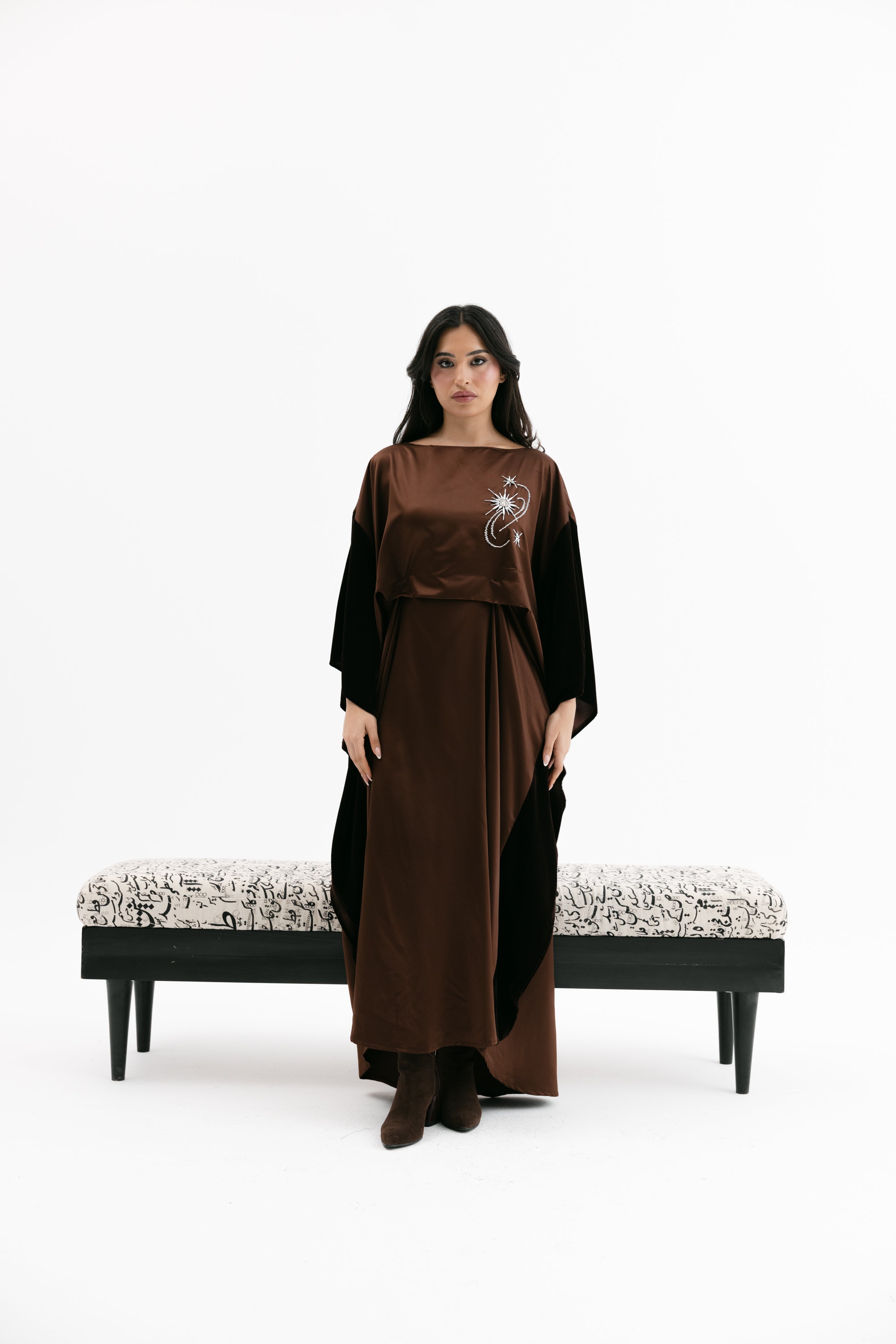 An elegant dress with a relaxed fit featuring a wide cape - style velvet sleeves, a subtle embroidered chest detail, and an inner tie / knot for an adjustable fit.