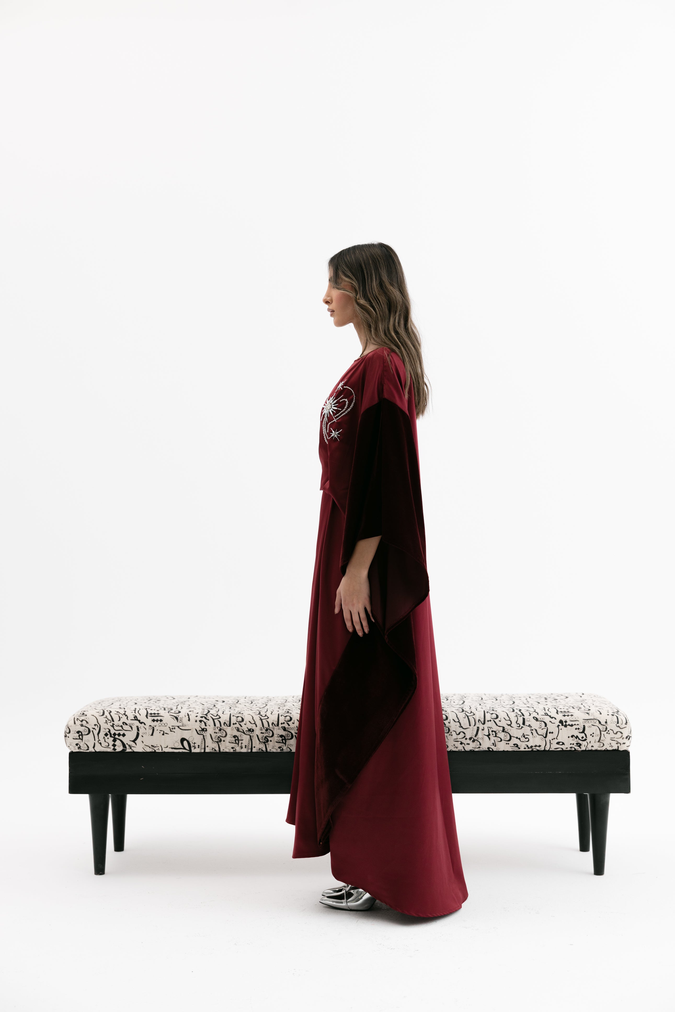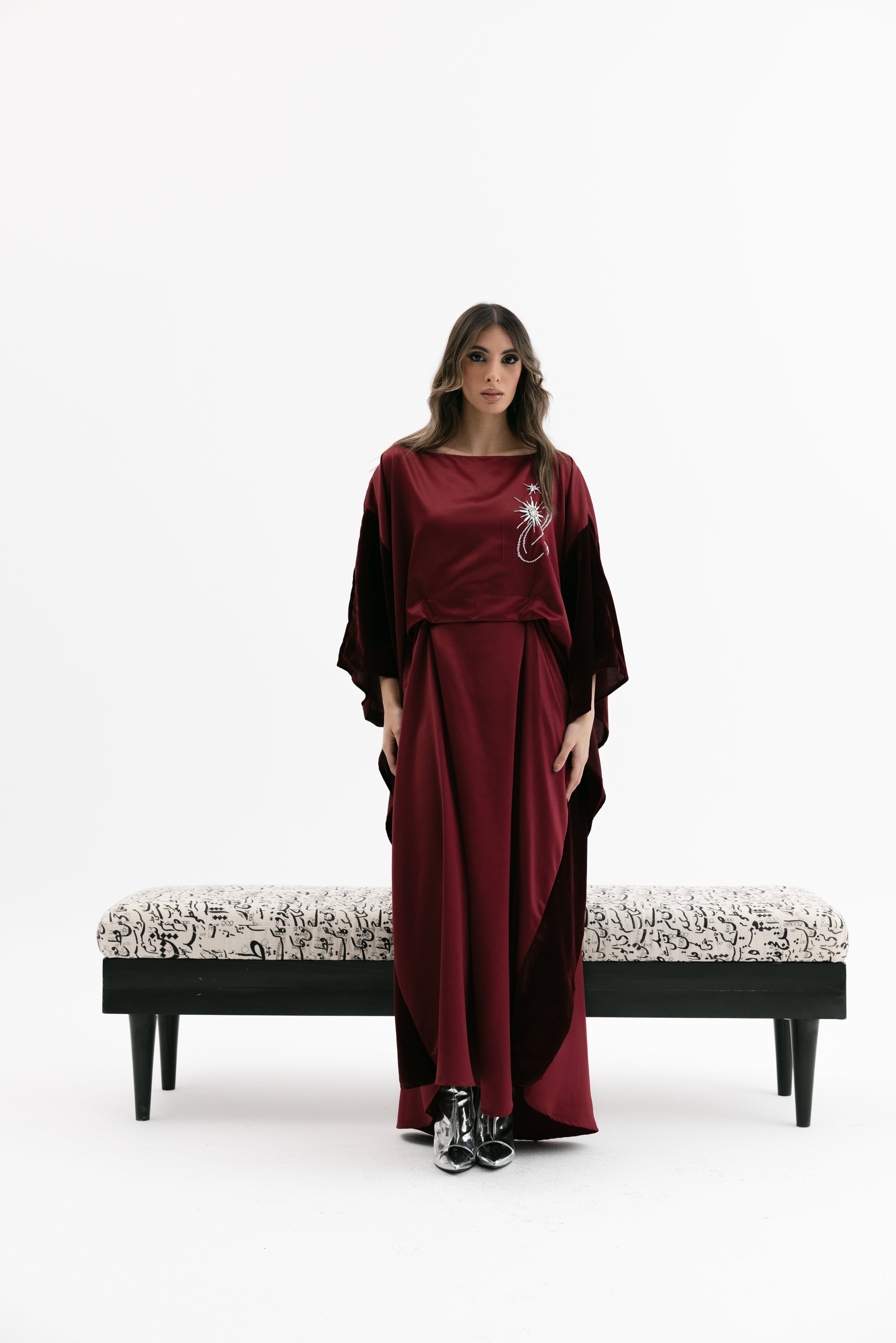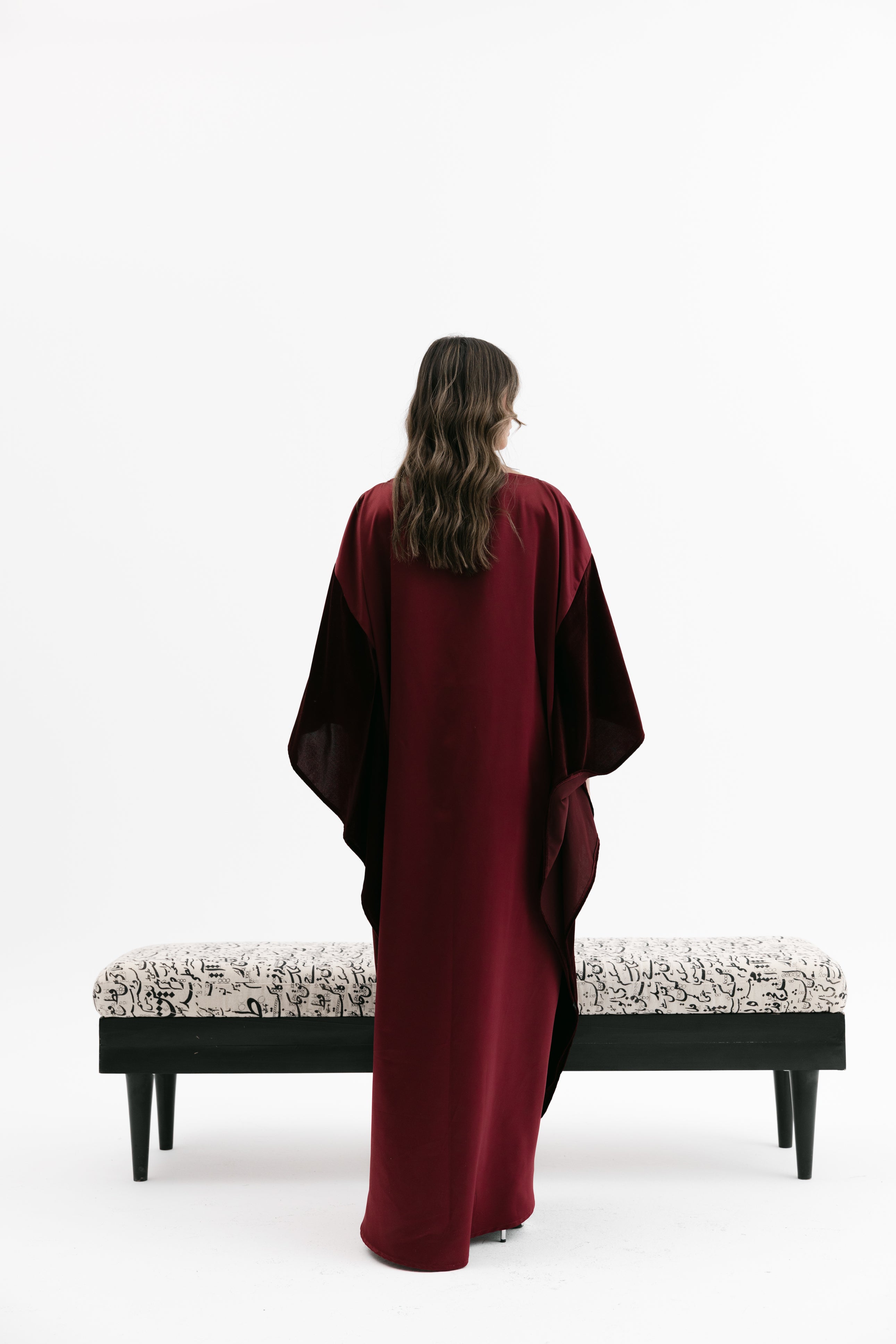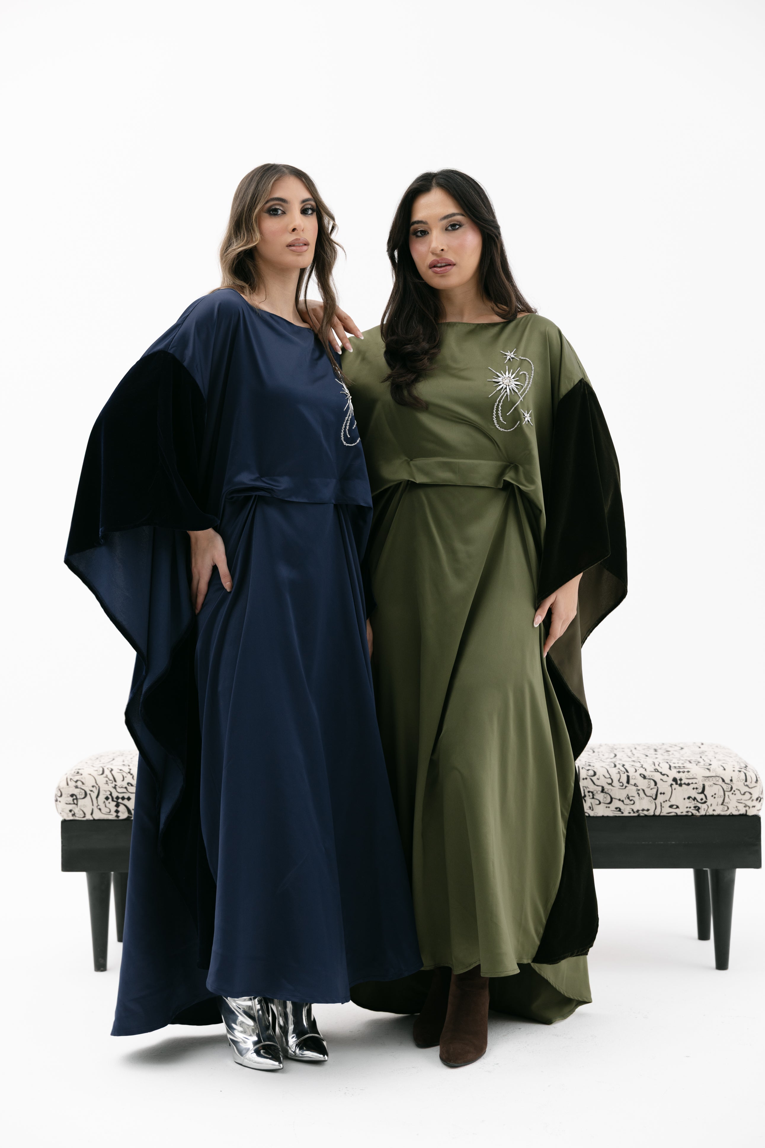 An elegant dress with a relaxed fit featuring a wide cape - style velvet sleeves, a subtle embroidered chest detail, and an inner tie / knot for an adjustable fit.
